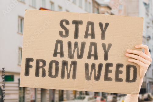 The phrase " Stay away from weed " on a banner in men's hand with blurred sea on the background. Dependence. Dependency. Conflict. Bad. Trouble. Difficulty. Anxiety. Difficult. Issue. Prevention