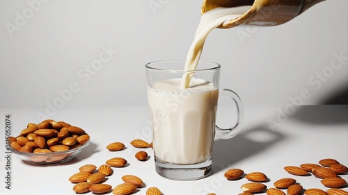 The process of pouring almond milk into a glass against the background of almonds in a bowl. The perfect drink for vegans, healthy eating and refreshing cocktails.