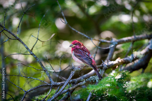The Purple Finch is the bird that has been famously described as a sparrow dipped in raspberry juice. This was taken deep in a boreal forest in North Quebec Canada.