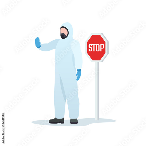 The quarantine zone. Medic prohibit entrance to contaminated area. The topic is relevant for concepts with vspyshki of coronavirus in China, USA, Europe, Italy, Germany, Spain, France