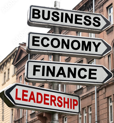 The road indicator on the arrows of which is written - business, economics, finance and LEADERSHIP