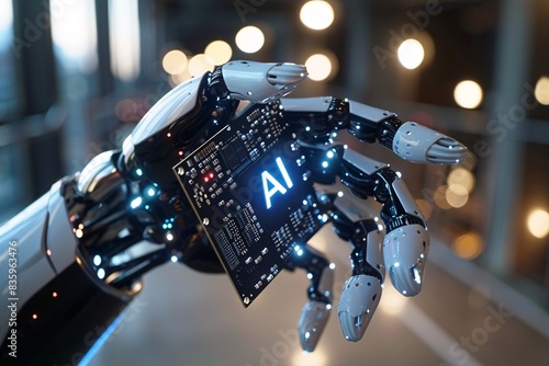 The robotic hand grasps a cutting-edge AI chip, working in tandem with futuristic artificial intelligence.