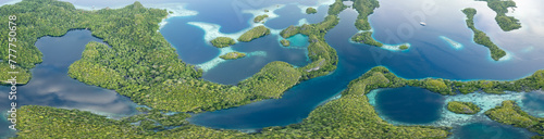 The scenic limestone islands of Pef, fringed by reef, rise from Raja Ampat's tropical seascape. This part of Indonesia is known as the heart of the Coral Triangle due its high marine biodiversity.