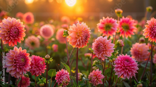 The serene majesty of a sunset over a field of dahlia flowers, their bold colors and intricate patterns creating a feast for the eyes.