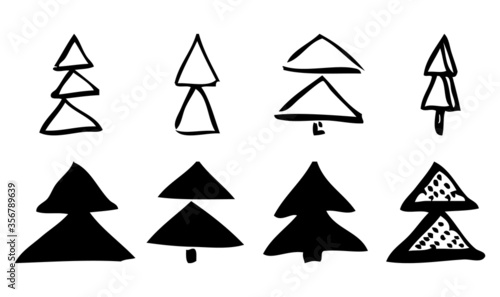 The set of stylized new year trees. The isolated silhouette in black on a white background. The simple and elegant design for decorations, prints on wrapping paper and cards. Dots, line, spots