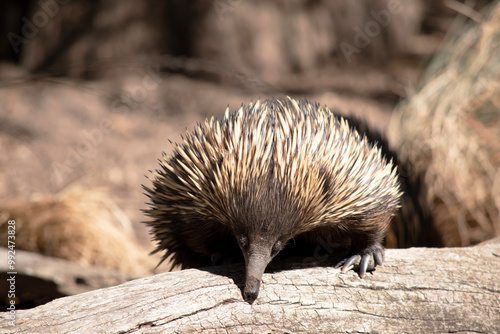 The short nosed echidna has strong-clawed feet and spines on the upper part of a brownish body.