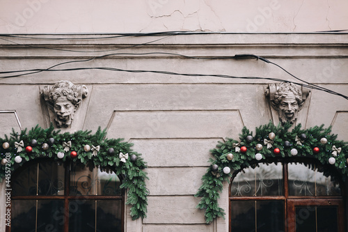 The showcase on the facade is decorated with Christmas wreaths and Christmas decorations. Funny old mascaron with grimace, protruding tongue and open mouth an old house. Lviv, Ukraine.