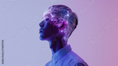 The side profile shows a person with a brain highlighted by a digital neural network, symbolizing intelligence and thoughts