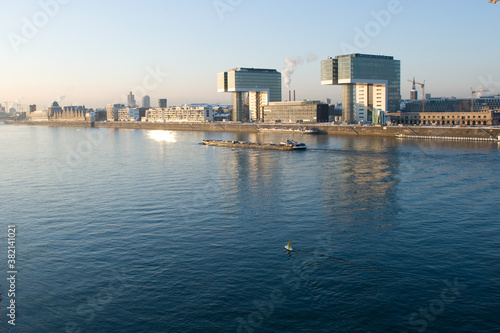 The skyline of the modern part of Cologne with its Kranhäuser in winter.
