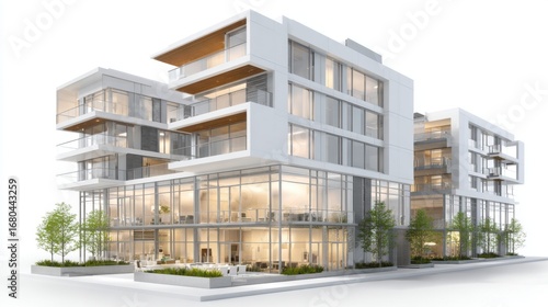 The sleek multi-story building features modern architecture with extensive glass windows. The design emphasizes natural light, blending indoor and outdoor living. Greenery surrounds the structure