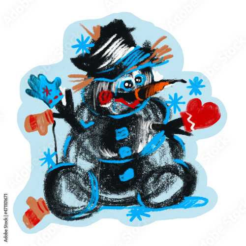 The snowman.A Christmas character. A fabulous creature. Cartoon hero.New Year's holidays.A caricature of a man. Make a snowman.Winter cold. For printing Stickers, postcards. Graphic, color drawing.