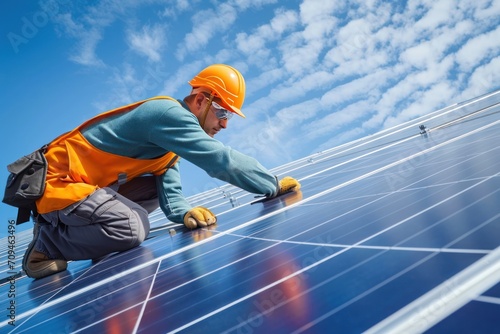 The solar farm(solar panel) Engineer service check installation solar cell on the roof