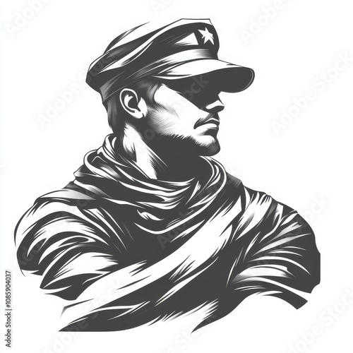 The soldier stands proudly, deep in thought, wearing a military cap and a flowing scarf