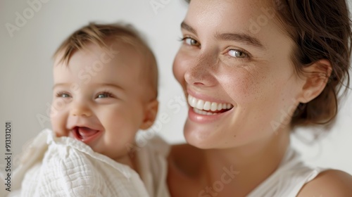 The strong emotional bond between a mother and her beaming baby is elegantly showcased in a bright studio.