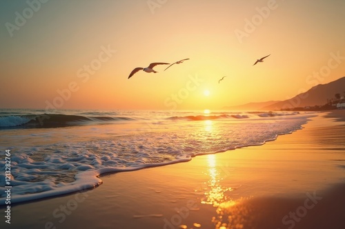 The sun sets over the ocean, casting a warm glow on the waves