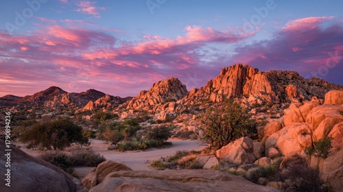 The sun sets over the rugged landscape of Joshua Tree National Park casting warm hues on the rocks. Clouds reflect beautiful shades in the evening sky creating a tranquil scene.