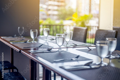The tables and chairs in the restaurant with full set preparation next to the window with flare in the afternoon , purple shade theme.