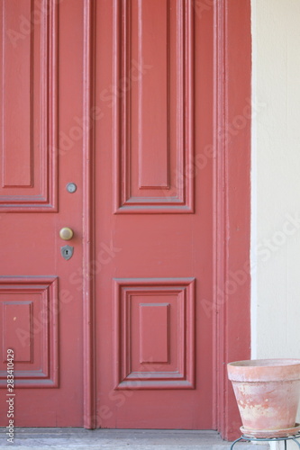 The traditional red door is the entrance to this house.