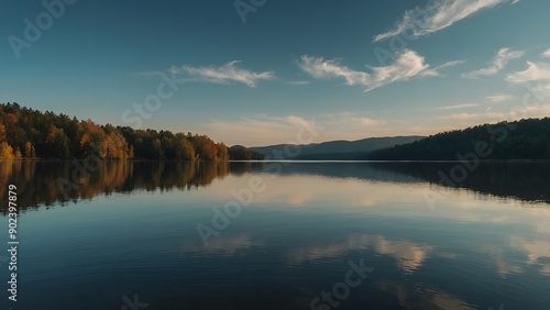 The tranquil beauty of the lake highlighted by the warm colors of a summer dawn