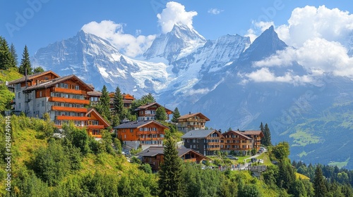The tranquil village of Mrren, perched on a mountainside with views of the Eiger, Mnch, and Jungfrau peaks in the Swiss Alps.