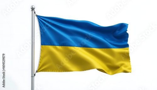 The Ukrainian national flag billows proudly on a flagpole against a stark white background.