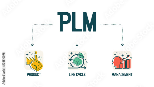 The vector infographic PLM - Product Lifecycle Management acronyms is a process of managing the entire lifecycle of a product from inception, through engineering design and manufacture, to service