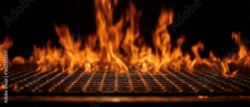 The vibrant flames dancing above a sizzling barbecue grill at dusk.