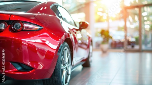 The vibrant red car gleams under natural light in a contemporary showroom, highlighting its elegant curves and sporty features