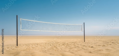 The volleyball net standing on a serene beach under a clear blue sky