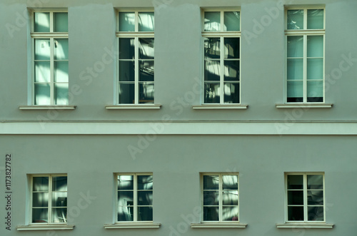 The wall of the old building, painted light green, has many windows, and in the windows you can see the play of shadows and light in the reflection, magical abstract paintings in the windows