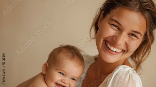 The warmth of a mother's smile and her baby's joyful expression shine brightly in a light-filled studio.
