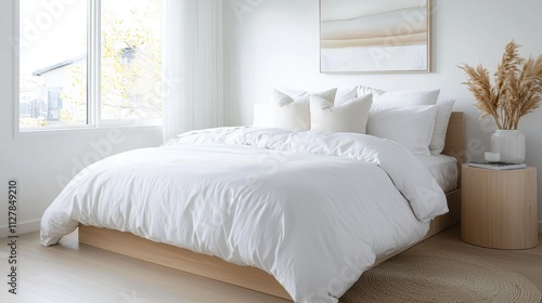 The white minimalistic bedroom features clean lines, sleek furniture, and a neutral color palette, creating a serene and clutter free space perfect for relaxation and rejuvenation.