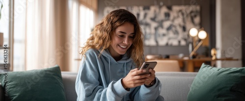 The woman enjoying her smartphone in a modern, cozy living room space.