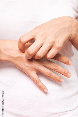 The woman is scratching her hand.
