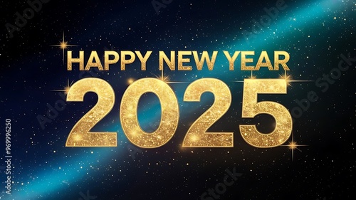 The words "Happy New Year 2025" written in sparkling, golden text with a starry background.