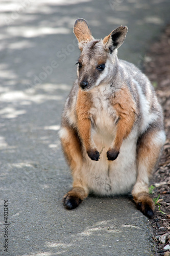 the yellow footed rock wallaby is standing on its hind legs