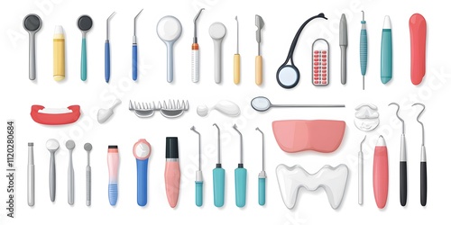 Theme: Teeth, Dentist, Dental Material, Icon Set, Shapes, Objects, Colorful, on White Background, Abstract Image, Texture, Pattern Background, Wallpaper, Cover and Screen of Smartphone, PC, Laptop,