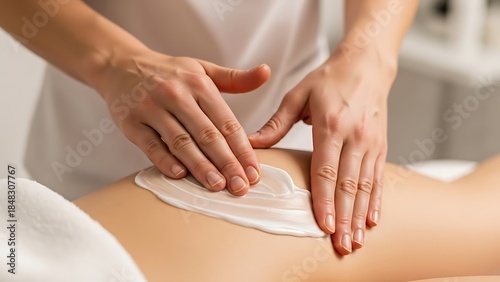 Therapist applying white cream to a person's back during a spa treatment