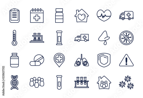 thermometers and coronavirus icon set, line style