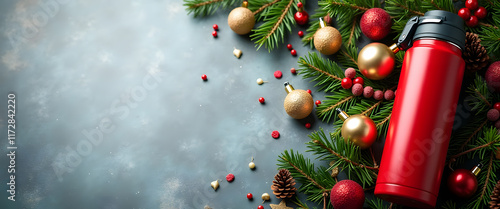 Thermos with fir branches, ornaments, and lights for a cozy Christmas atmosphere