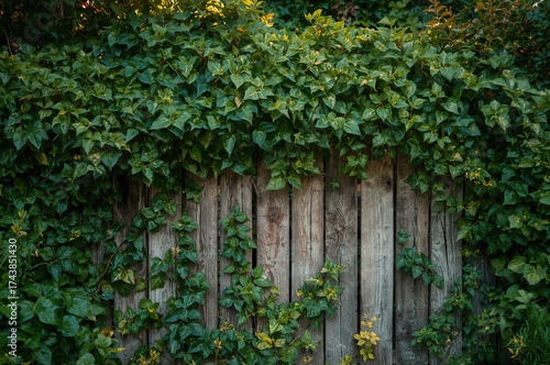 Thick Green Ivy Climbing on Weathered Wood Barrier