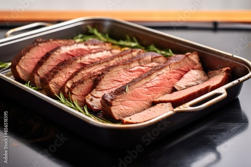 thick-cut beef brisket slices an oven tray