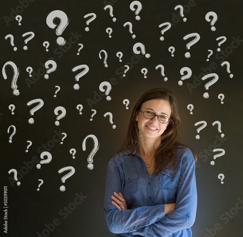Thinking business woman with chalk question marks
