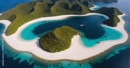This aerial image showcases a stunning island oasis with boats anchored in the tranquil blue lagoon, surrounded by vibrant coral reefs. The island's white beaches embrace the lush green center. AI