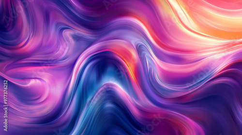 “This captivating abstract digital artwork showcases smooth, flowing waves of gradient hues, blending shades of purple, pink, blue, and orange. A vibrant and fluid composition