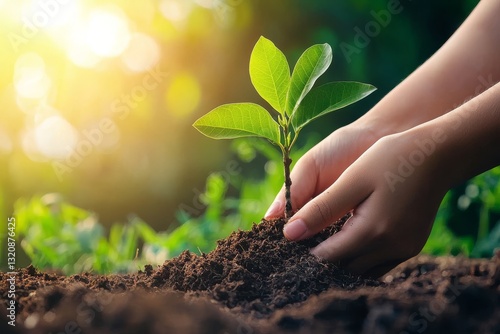 This close-up image of a woman planting a seedling in a vibrant garden represents sustainable living and green practices, suitable for environmental and gardening ideas