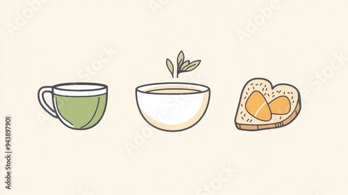 This collection features minimalist line icons of healthy food options, including a tea cup, bowl of soup, and egg on toast, promoting clean eating