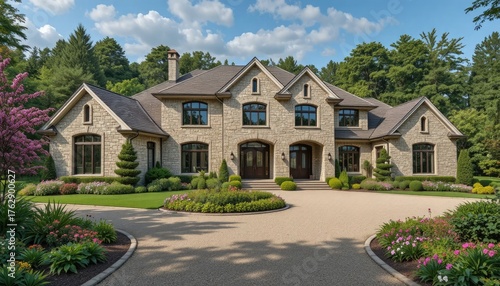 This contemporary stone home has a gravel driveway and a beautifully planted yard. This opulent home features a large exterior and modern style. A stunning facade encircled by lush vegetation and bl