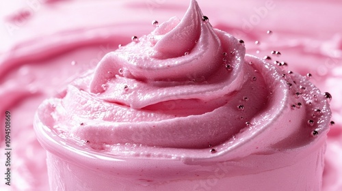 This dessert features a swirl of creamy pink frosting, adorned with tiny metallic sprinkles, creating an inviting and indulgent appearance. The soft texture and vibrant color enhance its appeal