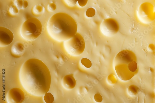 This detailed highdefinition closeup showcases the classic texture of Swiss cheese with its round holes and creamy yellow coloring, making it a delicious and nutritious dairy ingredient
